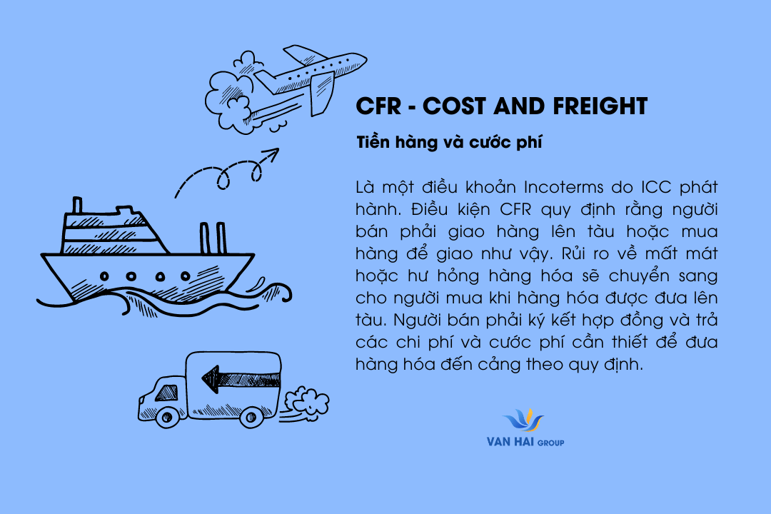 CFR là viết tắt của cụm từ tiếng anh Cost and Freight, có nghĩa là tiền hàng và cước phí. Đây là thuật ngữ trong thương mại quốc tế, quy định các nghĩa vụ, chi phí và rủi ro tương ứng liên quan đến việc chuyển giao hàng hóa từ người bán sang người mua theo tiêu chuẩn Incoterms do Phòng Thương mại Quốc tế (International Chamber of Commerce – ICC) công bố.