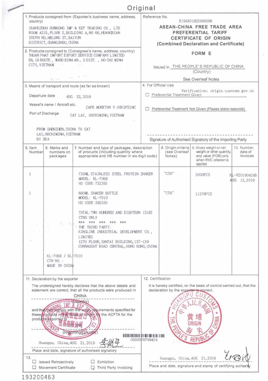 C/O form E là giấy xác nhận xuất xứ hàng hóa bắt buộc đối với doanh nghiệp muốn nhập khẩu hàng hóa từ Trung Quốc. CO form E được phát hành theo hiệp định ACFTA – Hiệp định khung về hợp tác kinh tế toàn diện ASEAN.
