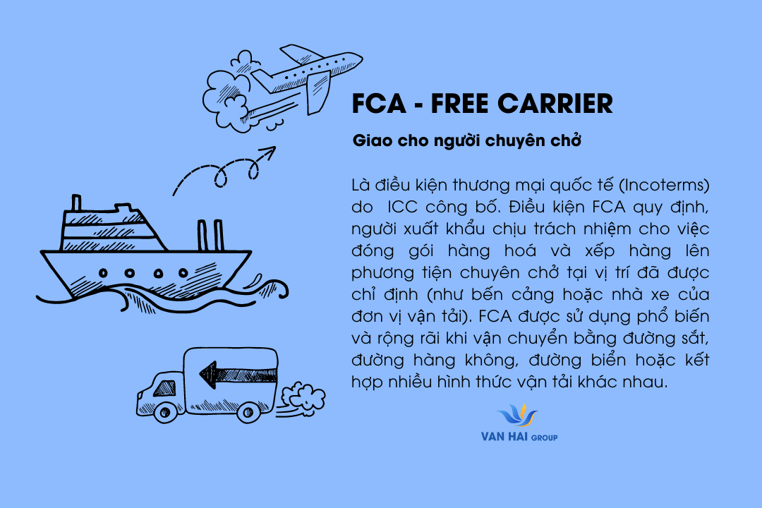 Điều kiện FCA áp dụng được cho mọi phương thức vận tải và vận tải đa phương tiện (hàng không, đường bộ, đường thủy, đường biển,….)