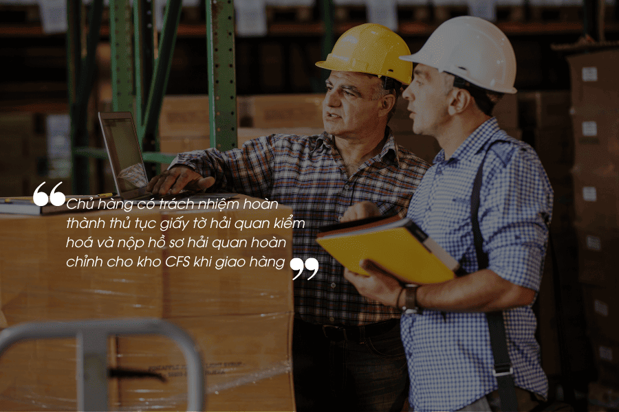 Chủ hàng có trách nhiệm hoàn thành thủ tục giấy tờ hải quan kiểm hoá và nộp hồ sơ hải quan hoàn chỉnh cho kho CFS khi giao hàng.