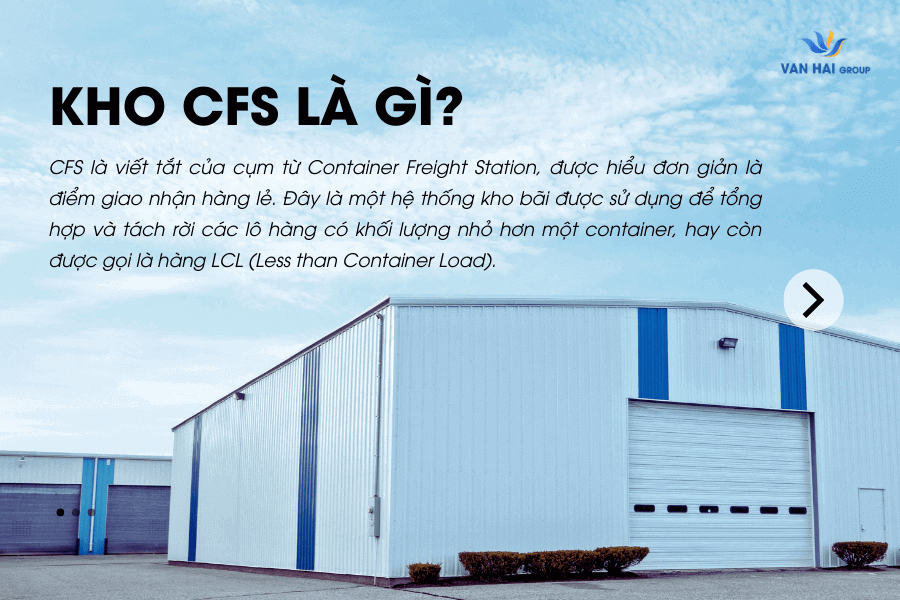 CFS là viết tắt của cụm từ Container Freight Station, được hiểu đơn giản là điểm giao nhận hàng lẻ. Nói một cách tổng quát, kho CFS là một hệ thống kho bãi được sử dụng để tổng hợp và tách rời các lô hàng có khối lượng nhỏ hơn một container, hay còn được gọi là hàng LCL (Less than Container Load). Tại kho CFS, các hàng lô sẽ được tập kết và lưu trữ tạm thời, và được hỗ trợ bởi một bộ phận công vụ trong quá trình xếp dỡ và bảo quản hàng, do đó các đơn vị phải trả phí vận hành được gọi là phí CFS.
